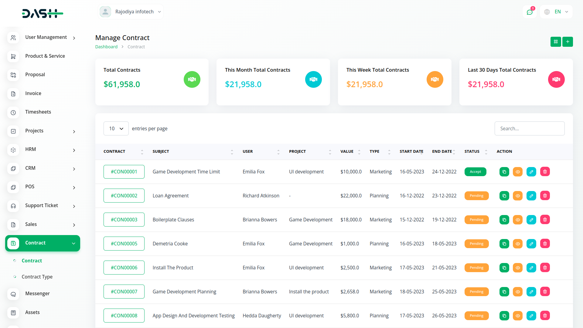Contract Module is very helpful for proper documentation of the contracts done with clients showing the type of contract, the value, and time duration. The predefined settings can be done/ updated through Setup.