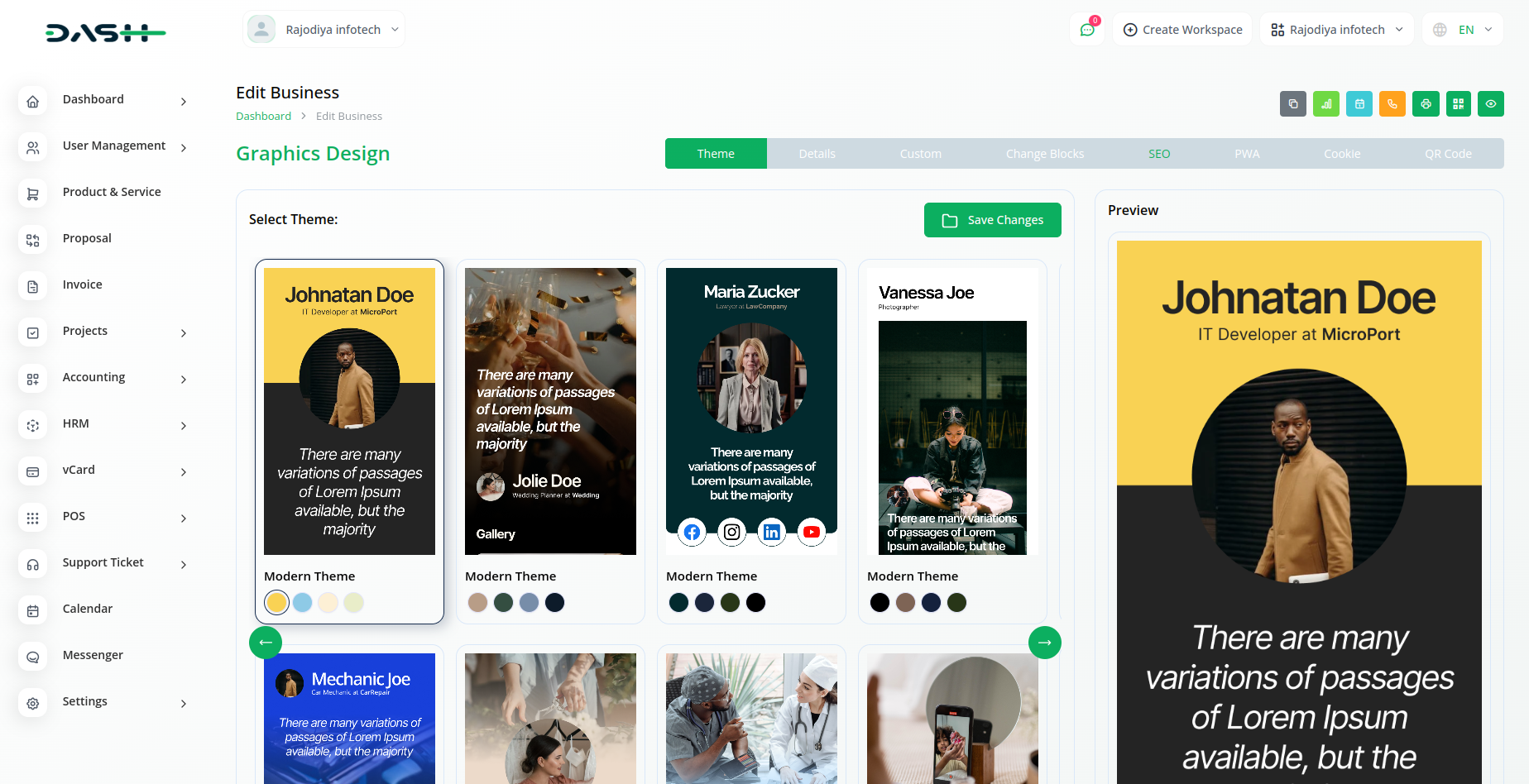 Customize your digital business card to match your brand.Choose from 21 beautiful themes with it`s unique colors.Add,modify update your business information quickly and easily.